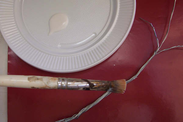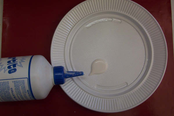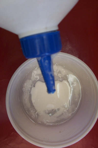 un recipiente, hacemos una mezcla al 50% de agua y cola blanca.
