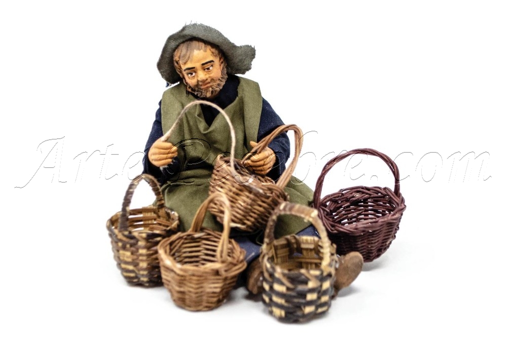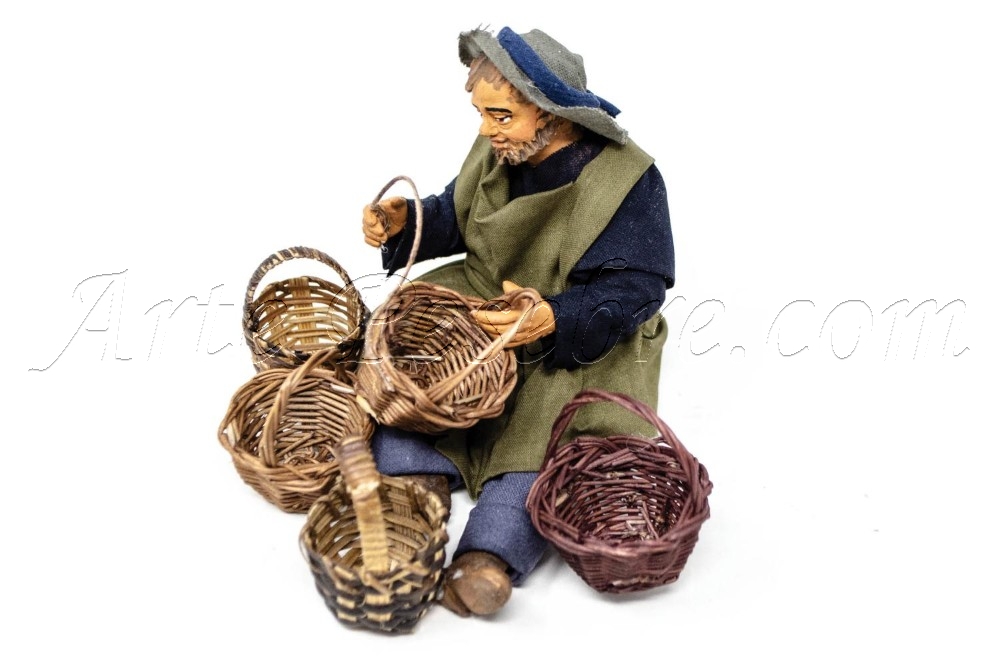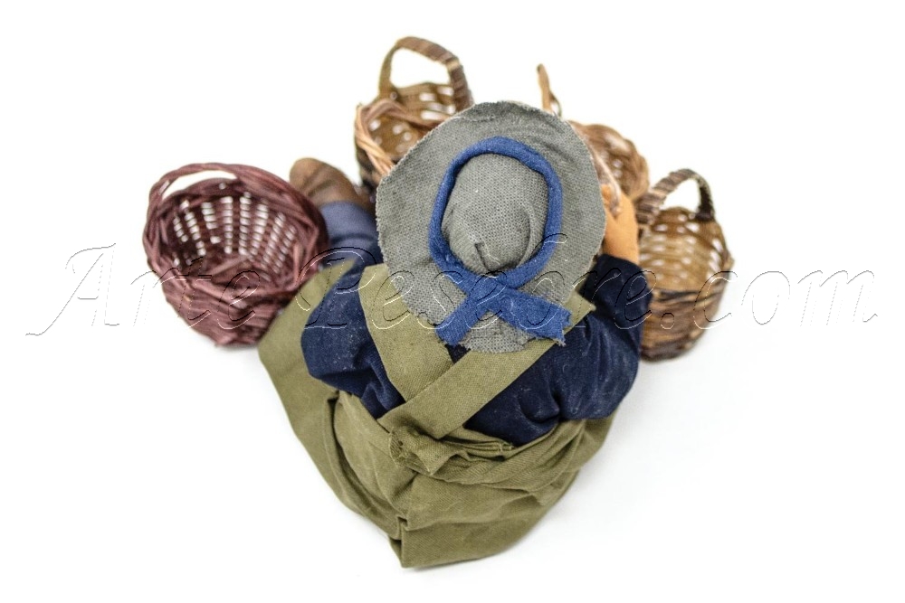 Descripción: Canastero. Figura de barro vestida con tejidos de alta calidad. Rostros extremadamente refinados y gran atención al detalle