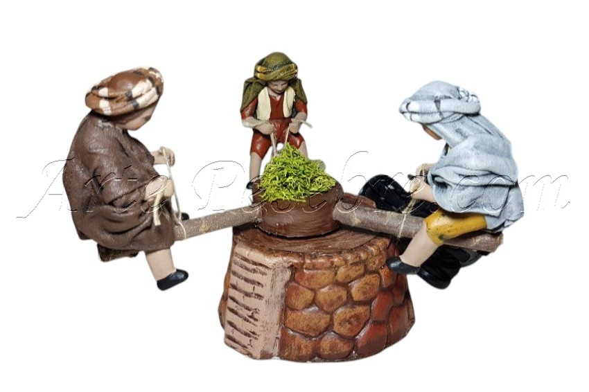 Descripción: Grupo de niños en balancín giratorio, barro lienzado