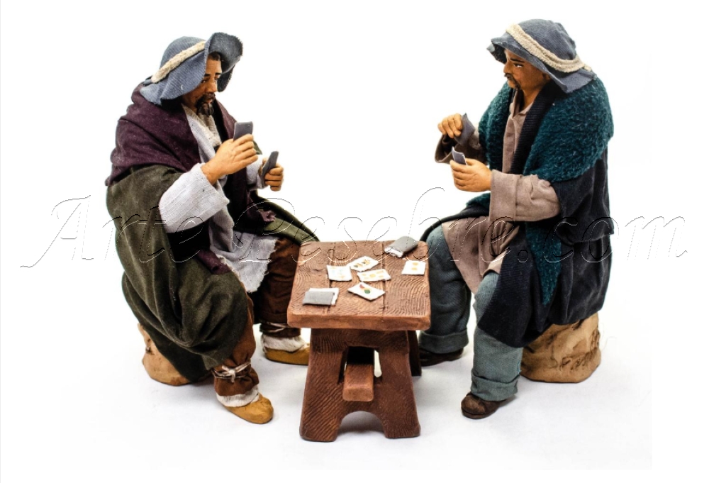 Descripción: Pareja de jugadores de cartas. Figura de barro vestida con tejidos de alta calidad. Rostros extremadamente refinados y gran atención al detalle