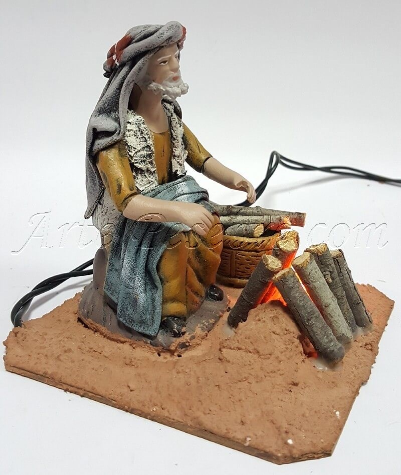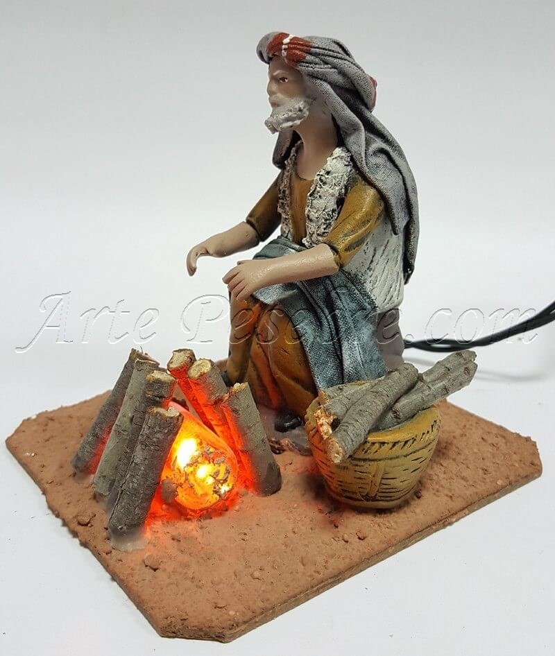 Descripción: Pastor calentándose con luz para figuras de 14 cm, en barro lienzado