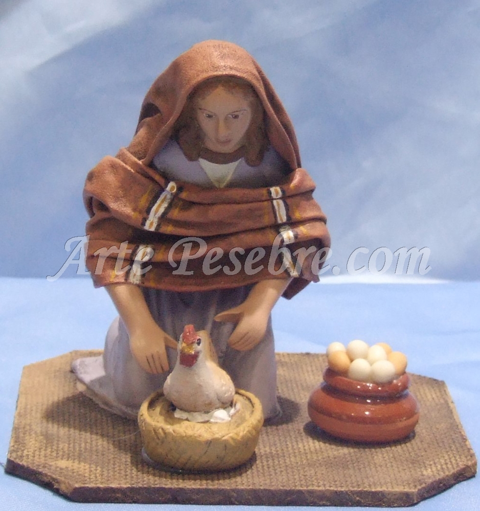 Pastora arrodillada vendiendo huevos