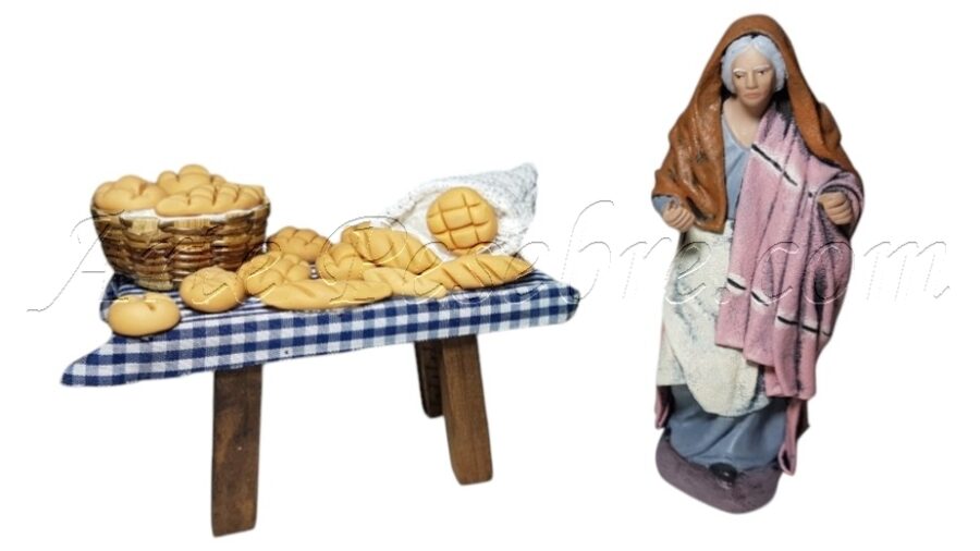 Descripción: Pastora con puesto de pan para figuras de 12-14 cm, en barro lienzado